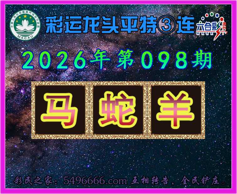098期: 👉『彩运龙头』 👉平特③连👉【马蛇羊】开:00准