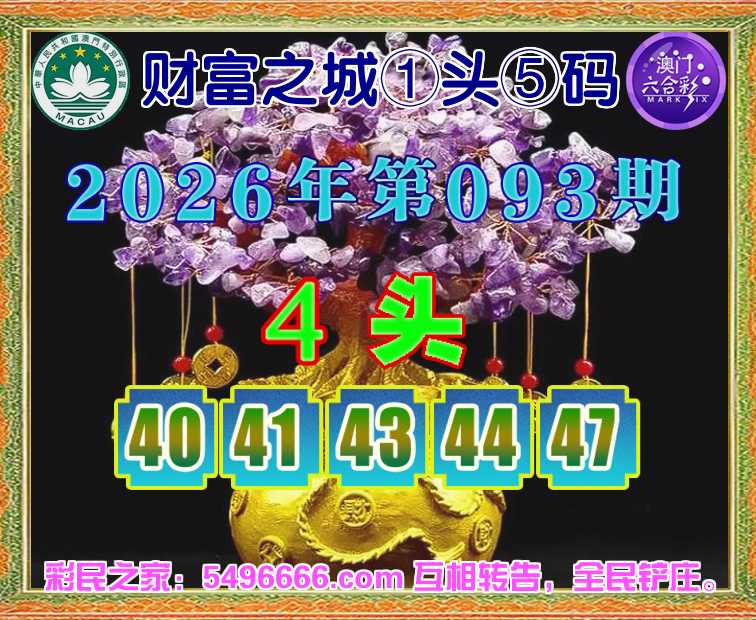 093期: 财富之城 🌲①头⑤码🌲【4头主:40.41.43.44.47】开:40