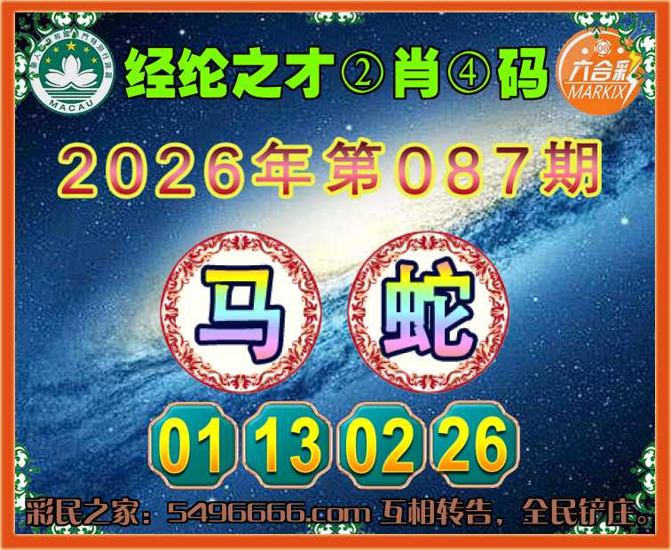 087期: 🧩《经纶之才》 🧩②肖④码🧩【马】【01.13.02.26】开:蛇26